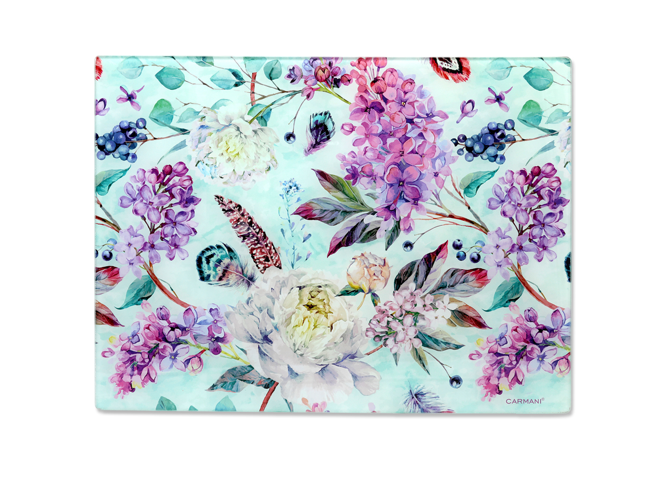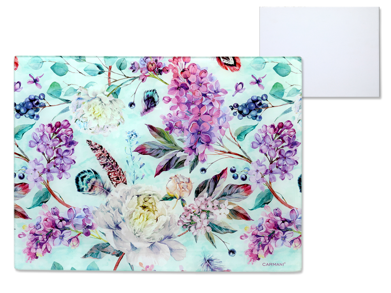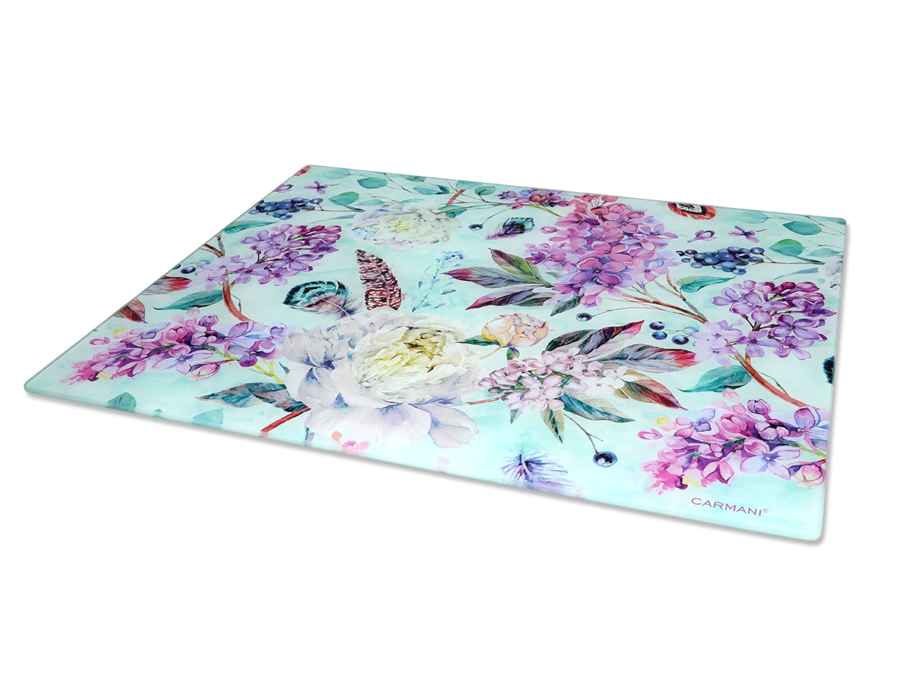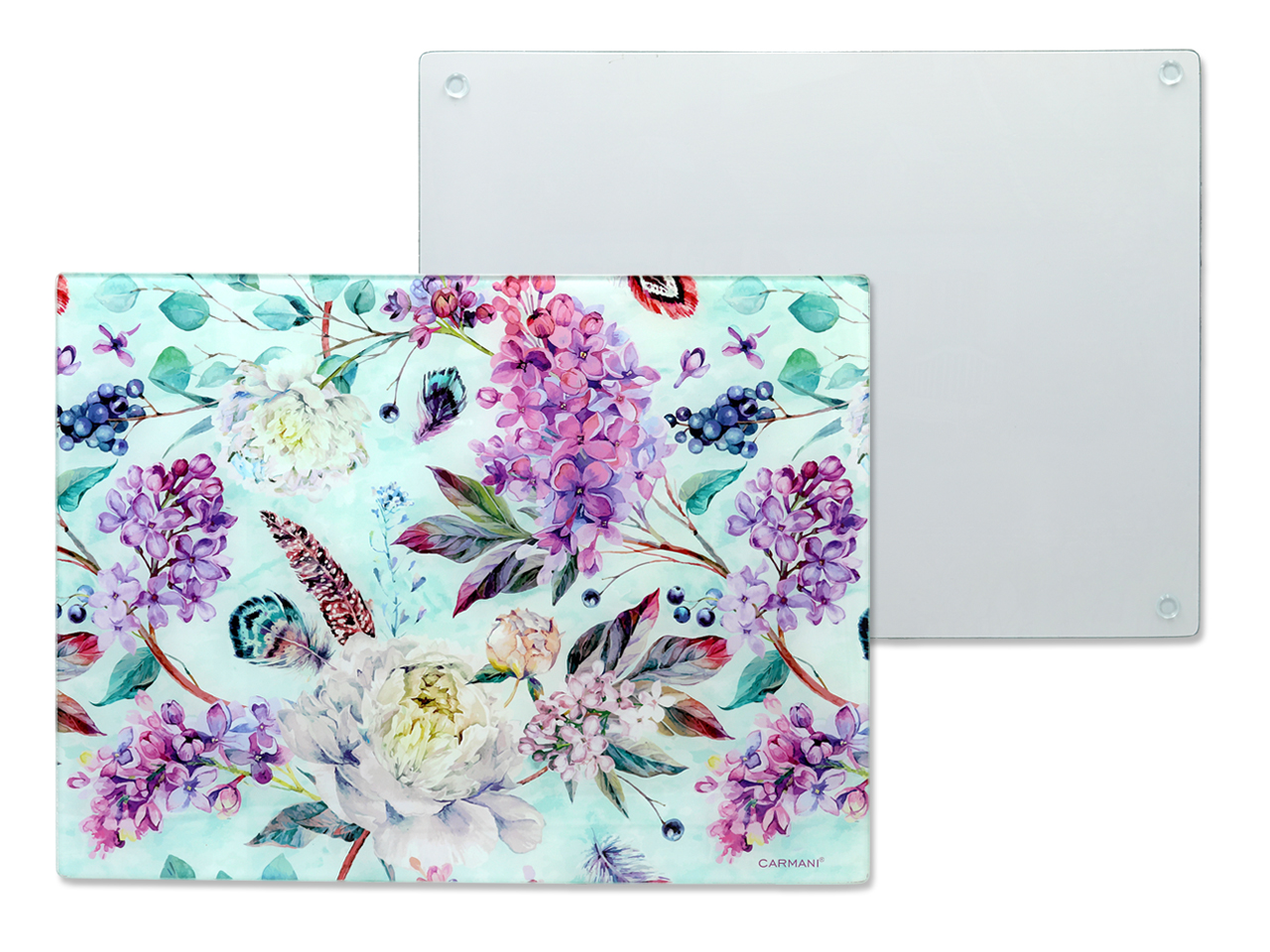 Gładka, błyszcząca tafla deski szklanej to doskonałe tło dla pięknych, kwiatowych dekoracji – bo kto powiedział, że produkty praktyczne, jak deska szklana nie mogę być piękne?