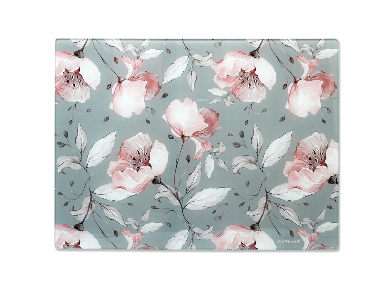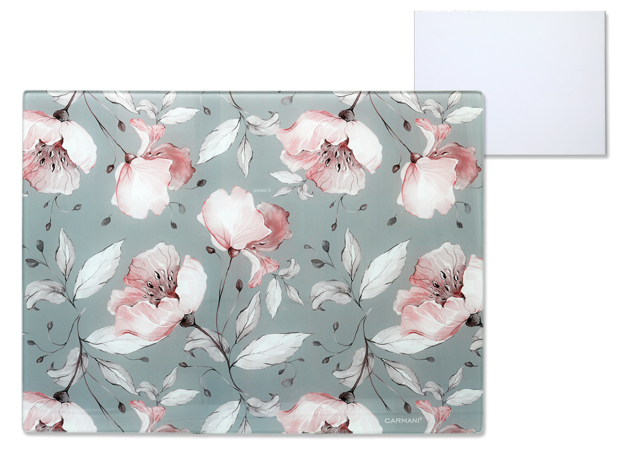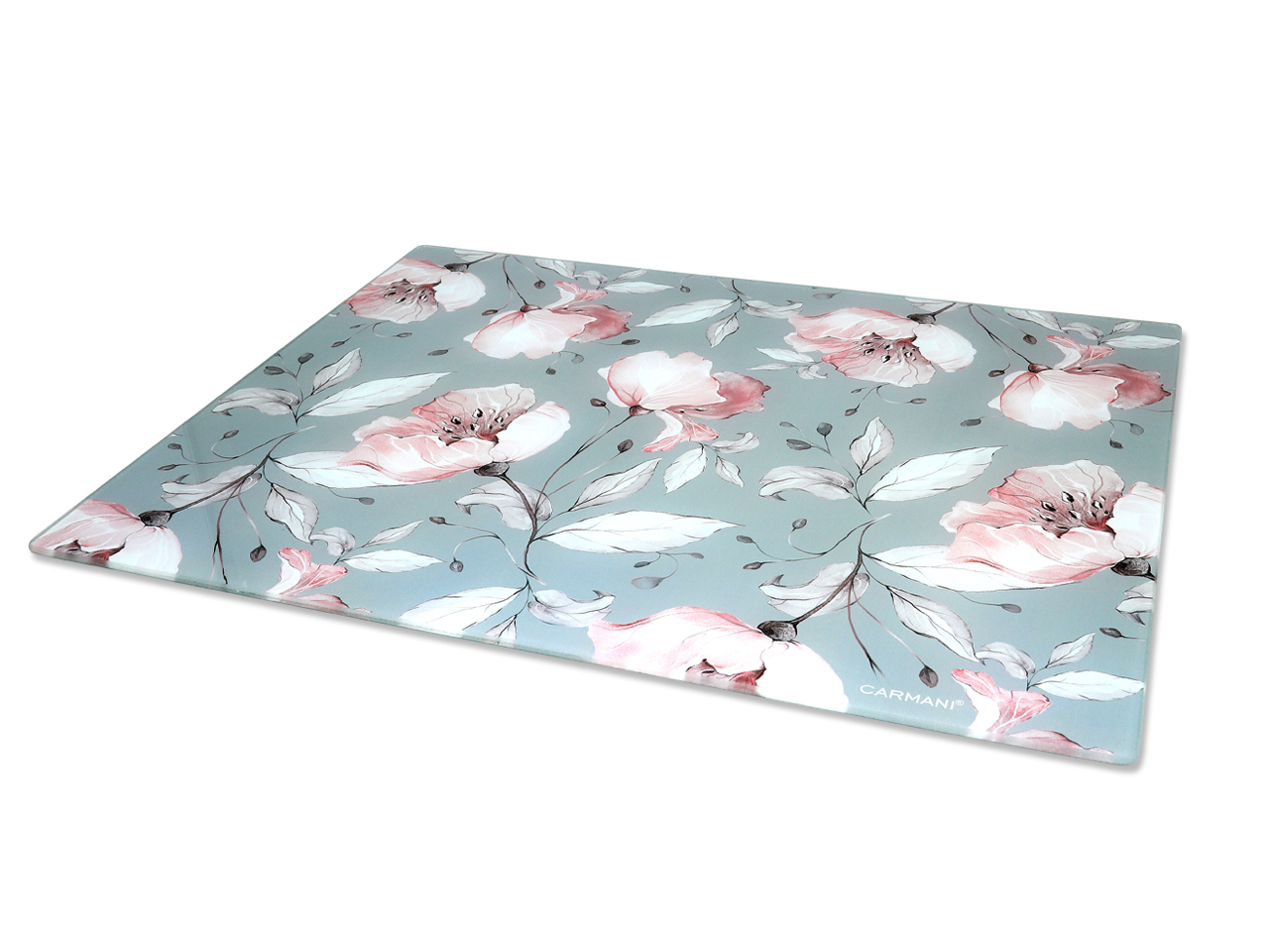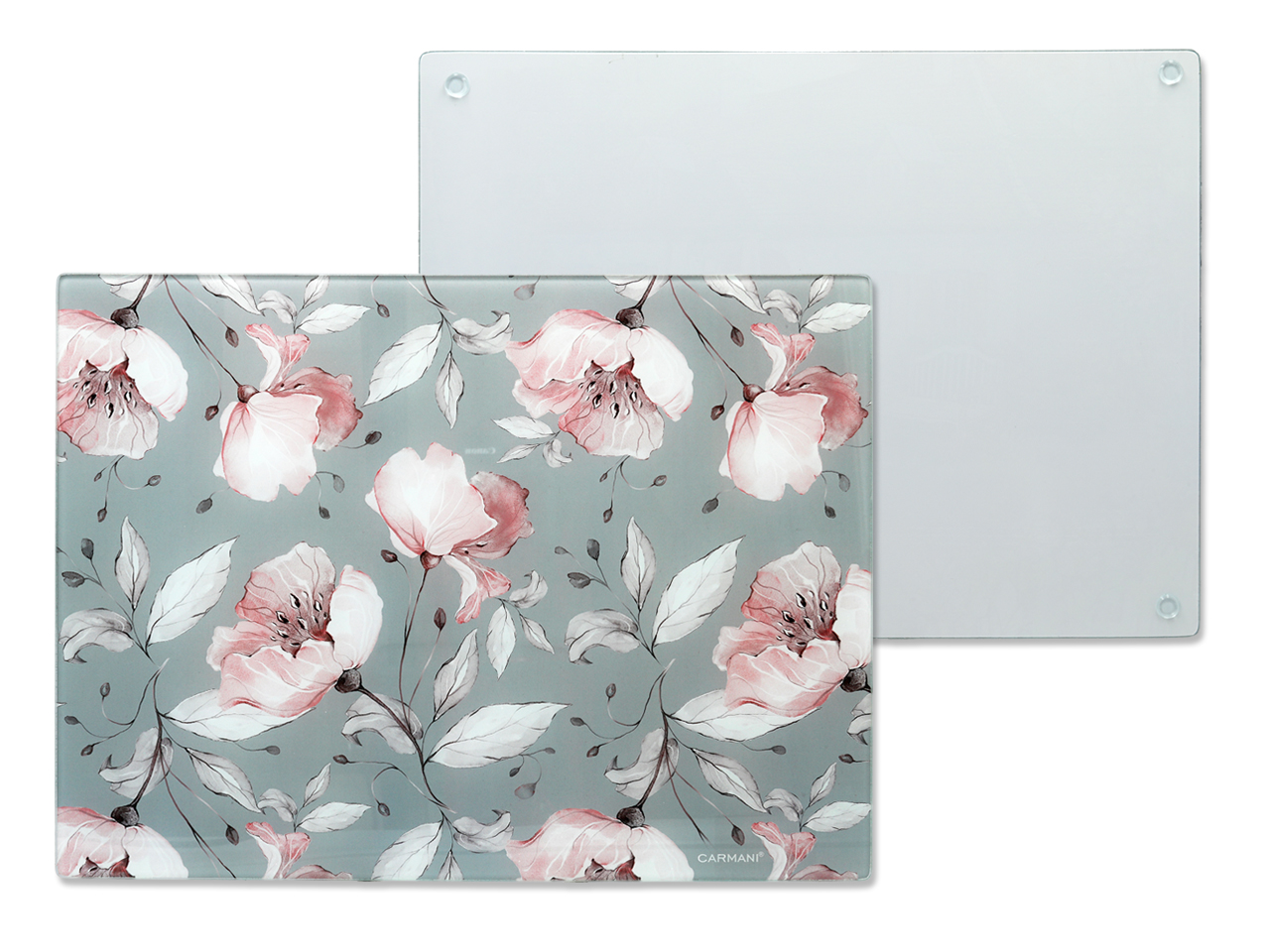 Gładka, błyszcząca tafla deski szklanej to doskonałe tło dla pięknych, kwiatowych dekoracji – bo kto powiedział, że produkty praktyczne, jak deska szklana nie mogę być piękne?