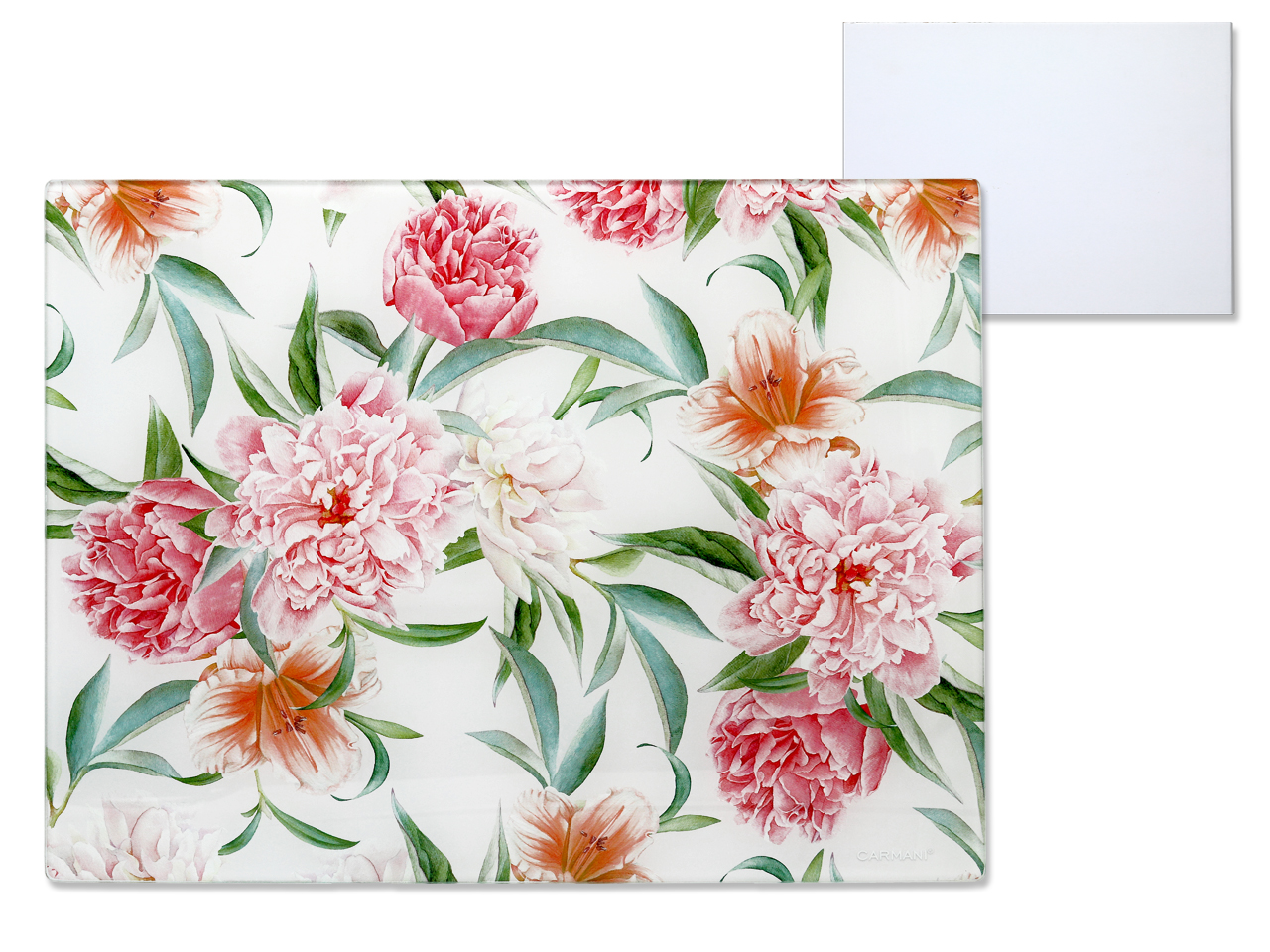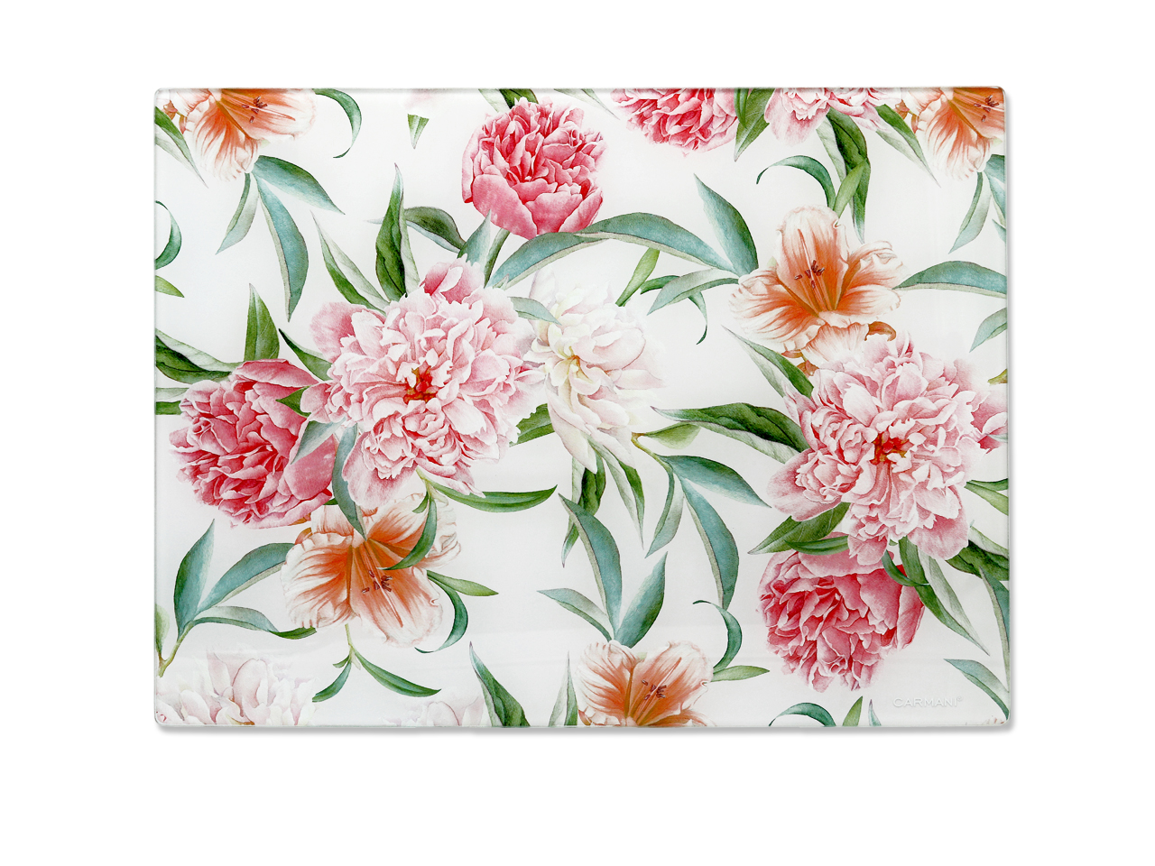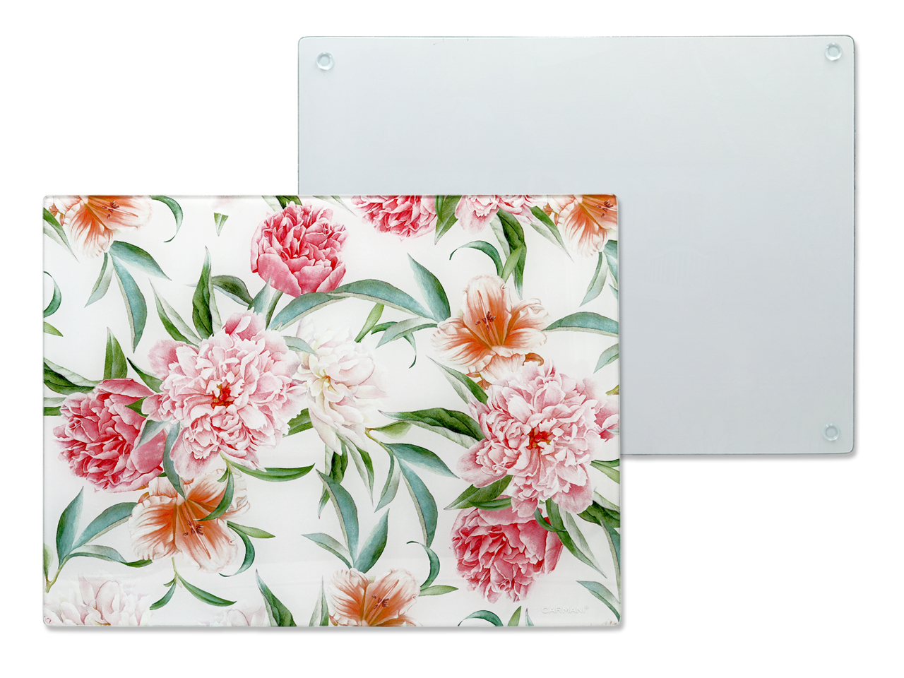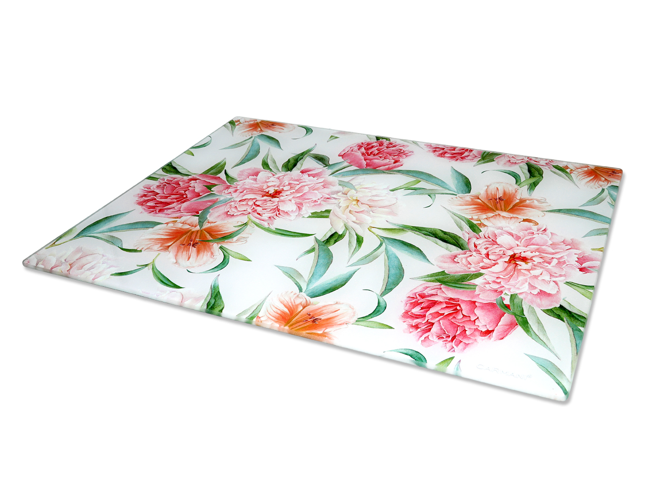 Gładka, błyszcząca tafla deski szklanej to doskonałe tło dla pięknych, kwiatowych dekoracji – bo kto powiedział, że produkty praktyczne, jak deska szklana nie mogę być piękne?