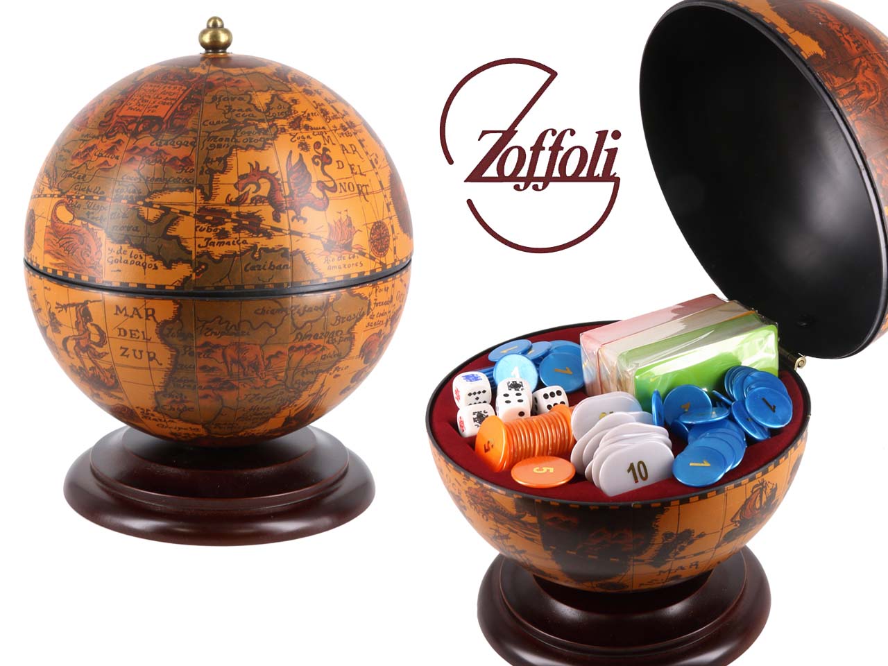 Globus biurkowy zawiera zestaw do gry w pokera. Globus jest reprodukcją XVI-XVIiI-to wiecznych map.