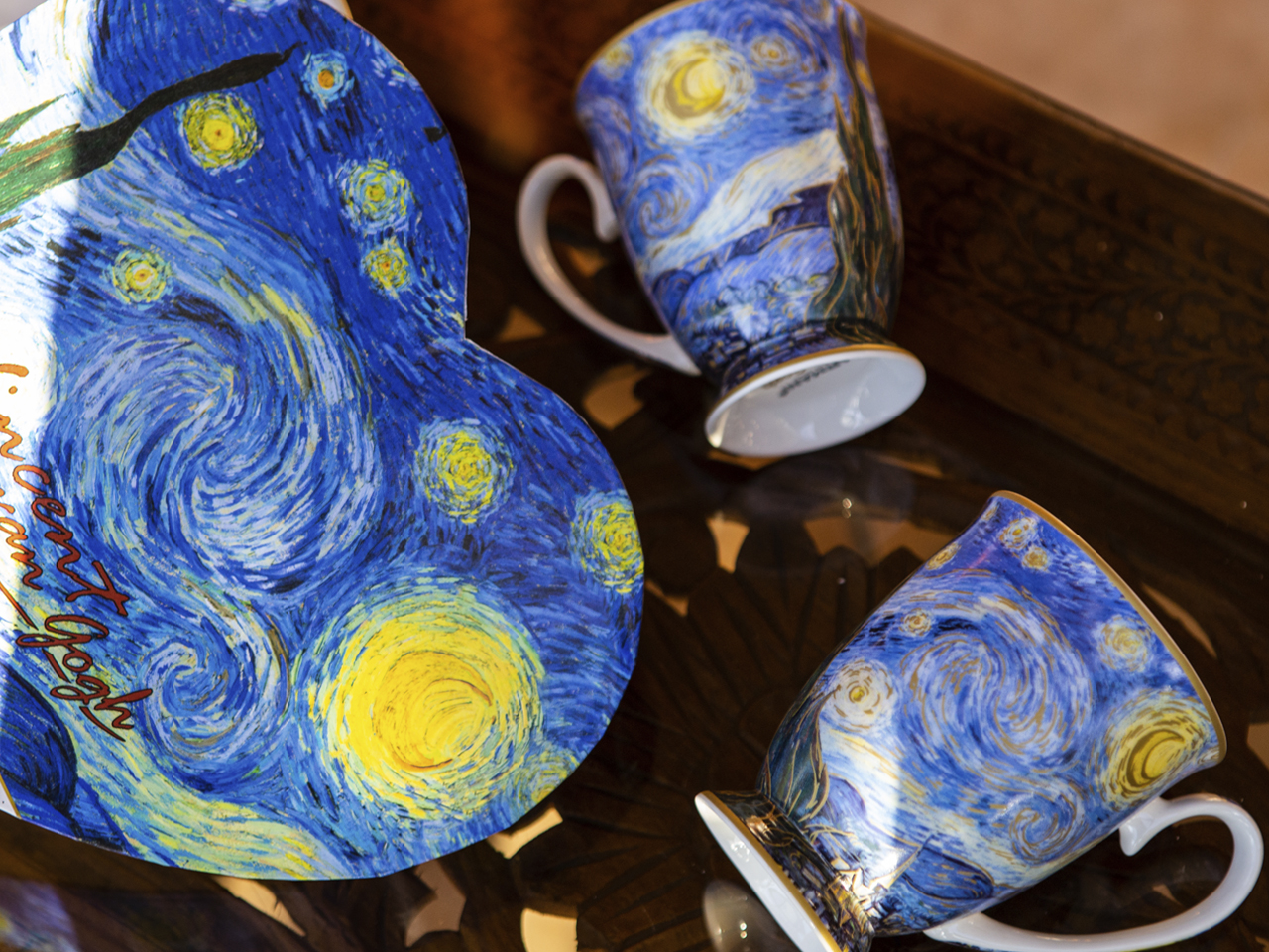 Komplet 2 pięknych kubków, ozdobnionych w dzieła holenderskiego malarza Vincenta van Gogha. Zapakowane w pudełko w kształcie serca, świetnie się prezentuje i idealnie nadaje się jako prezent.