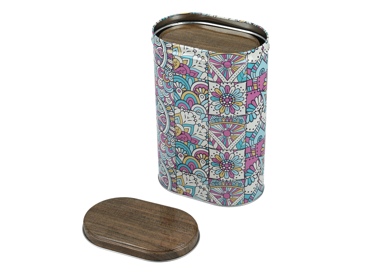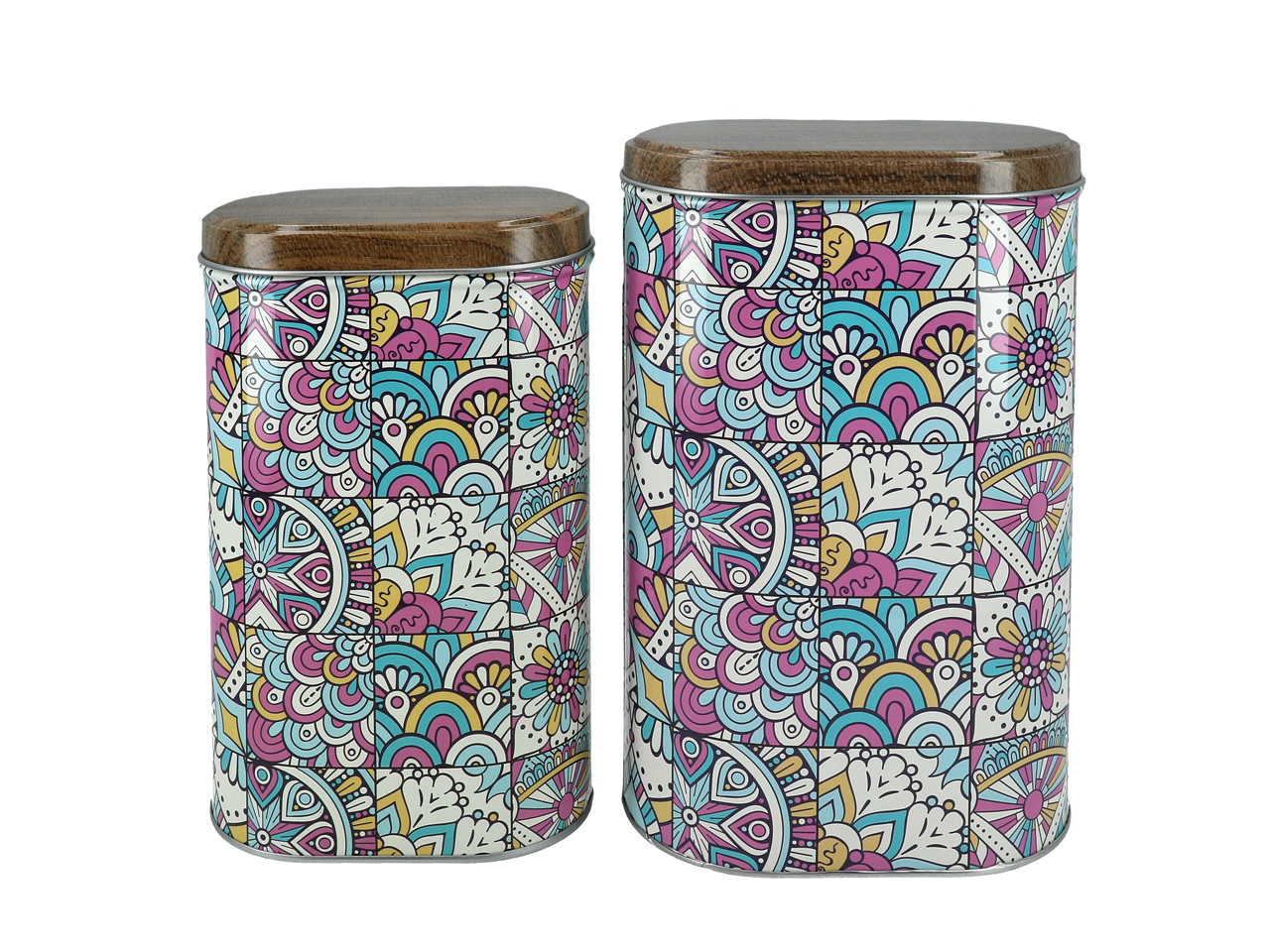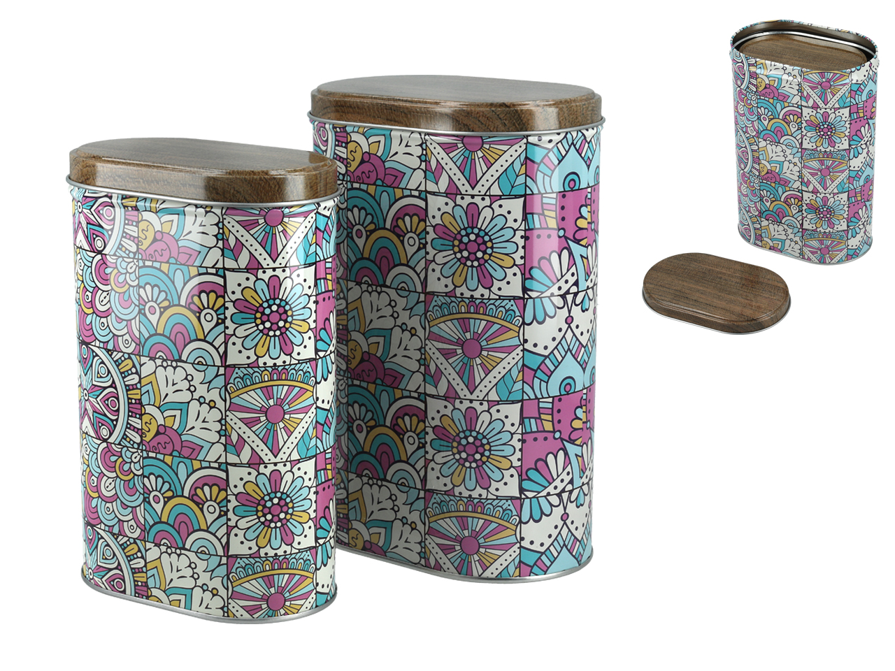 Komplet 2 owalnych, kolorowych puszek świetnie się prezentuje także na otwartych półkach i blatach.