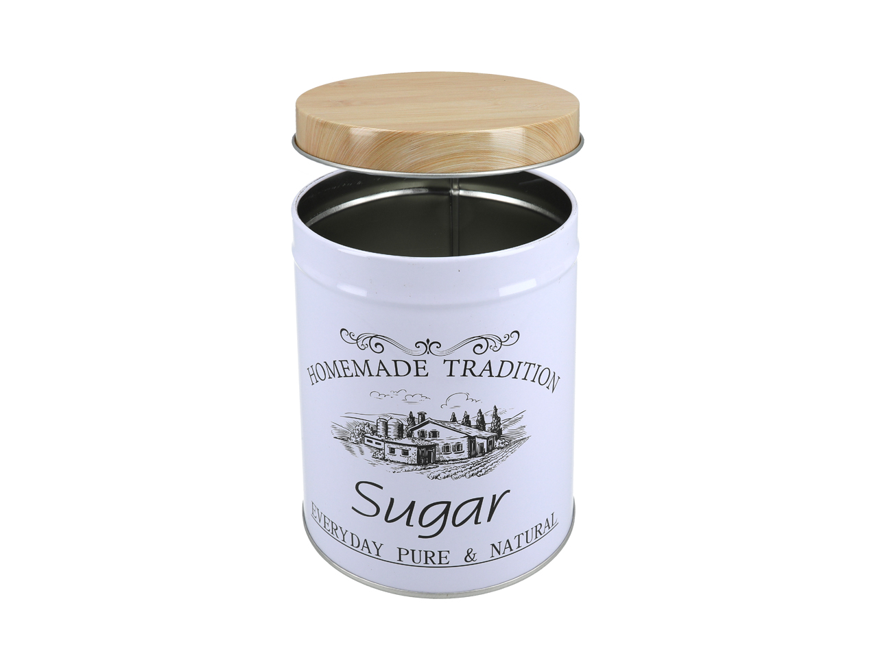 Trzy białe puszki w tym samym rozmiarze, każda odpowiednio podpisana: herbata, kawa, cukier.