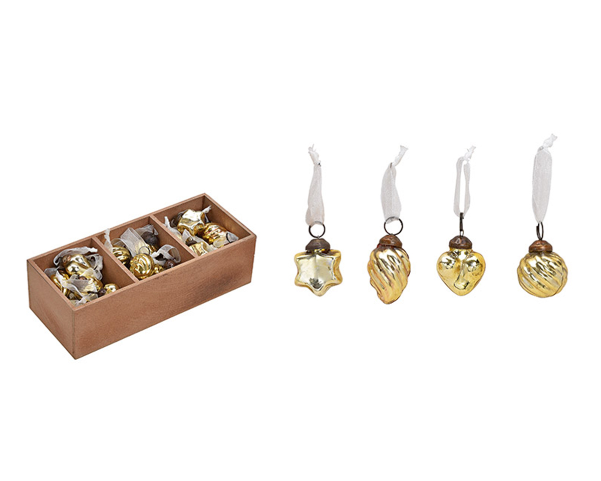 Kpl. 36 złotych bombek choinkowych w drewnianym pudełku 25x5x9cm
