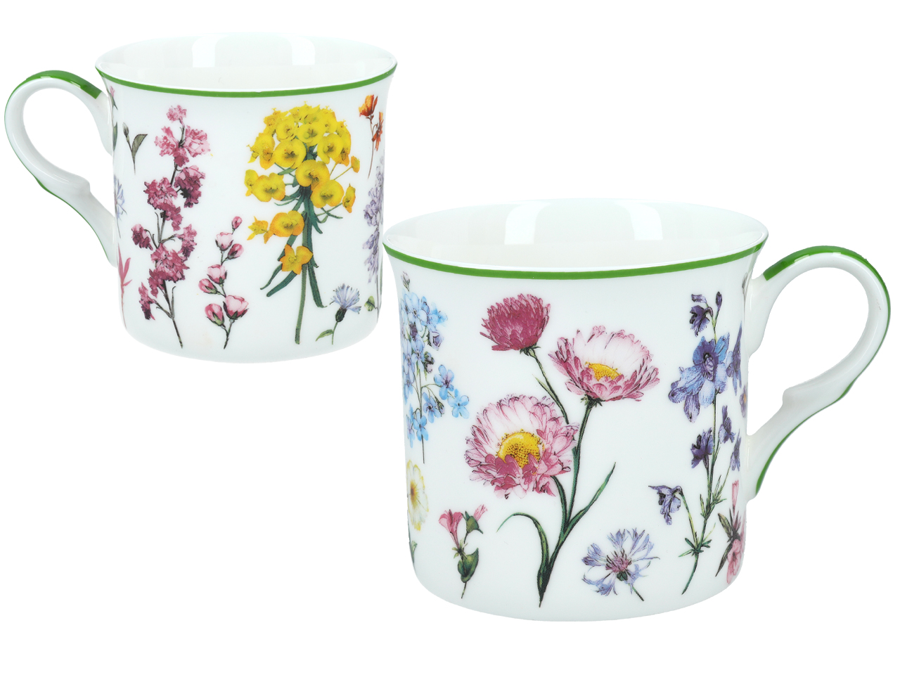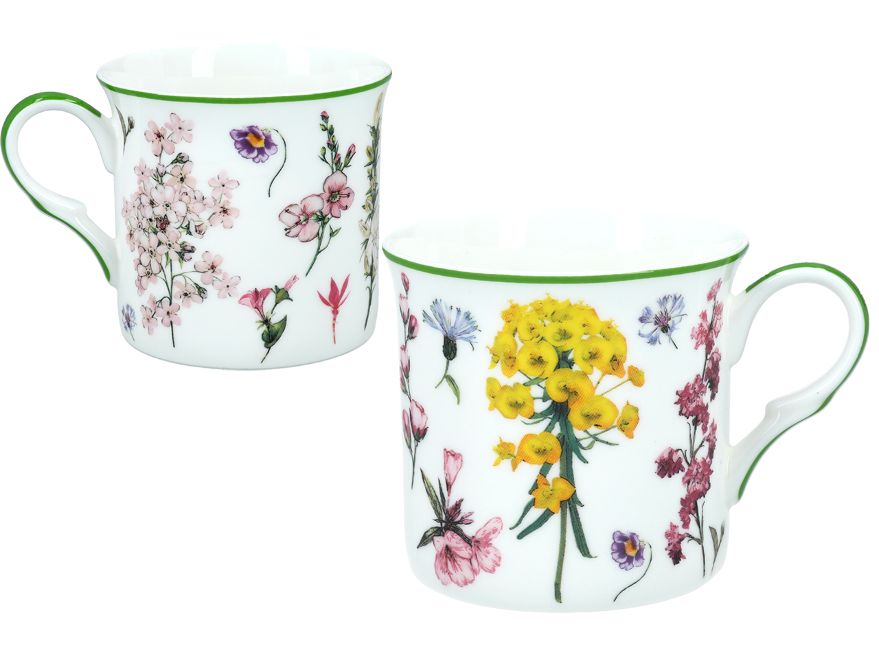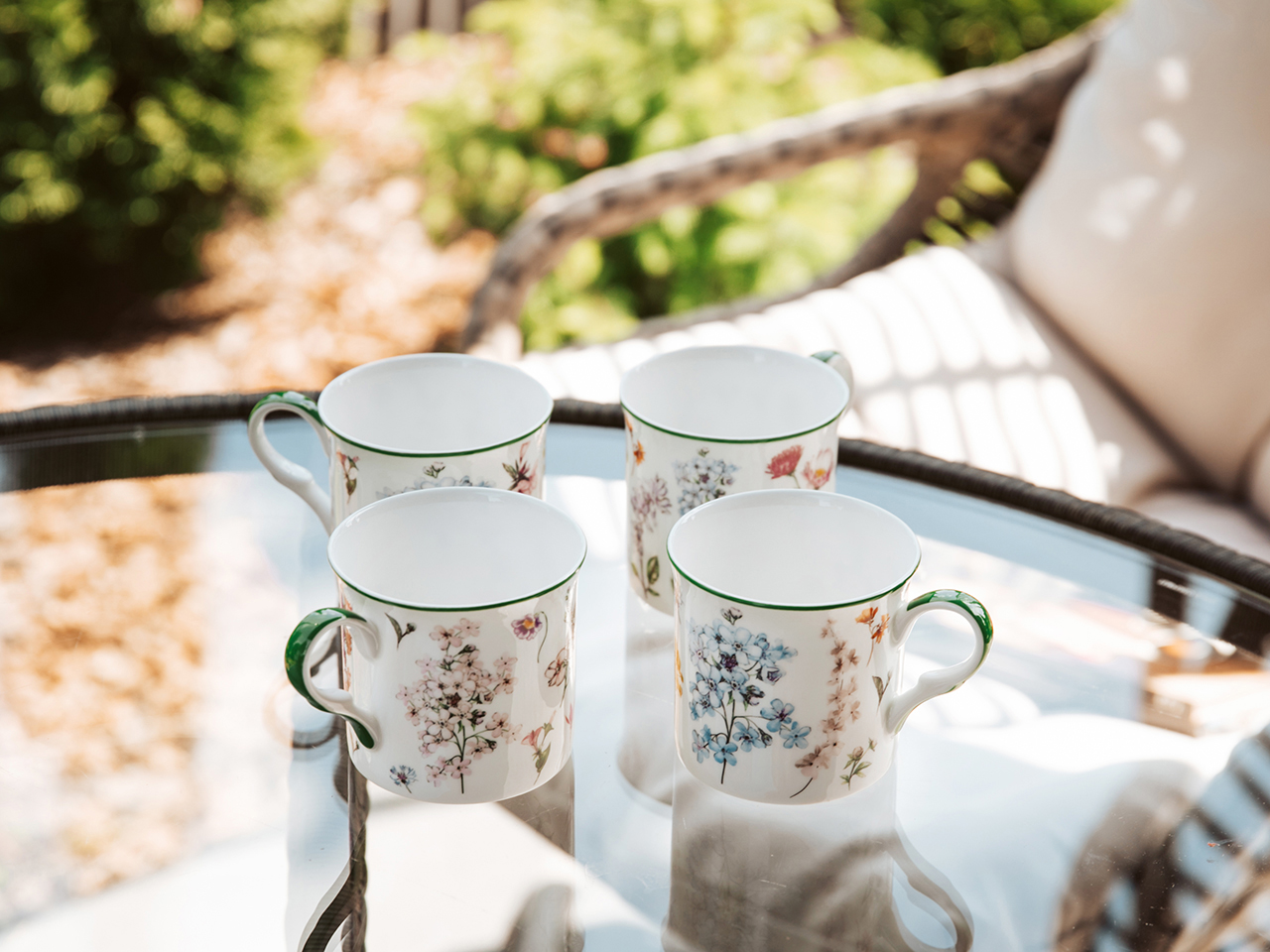 Zestaw czterech porcelanowych kubków o pojemności 295ml, każdy z unikalną kwiatową ilustracją. Kubki są trwałe, wygodne i idealne do codziennego użytku.