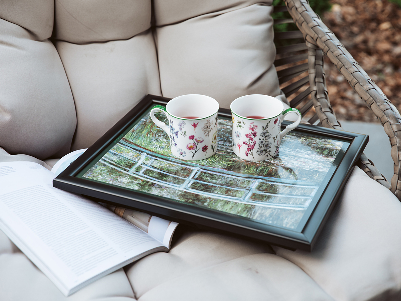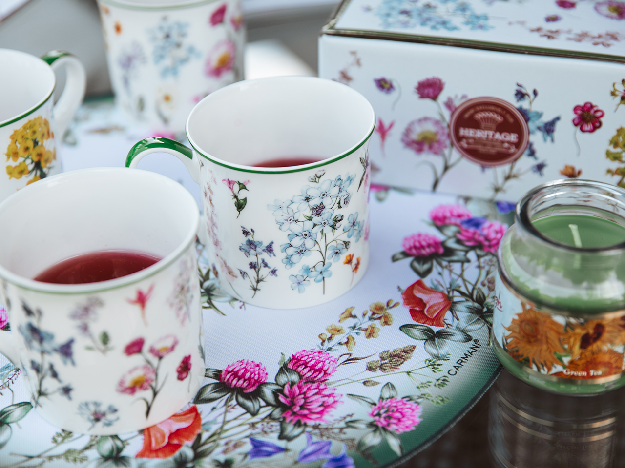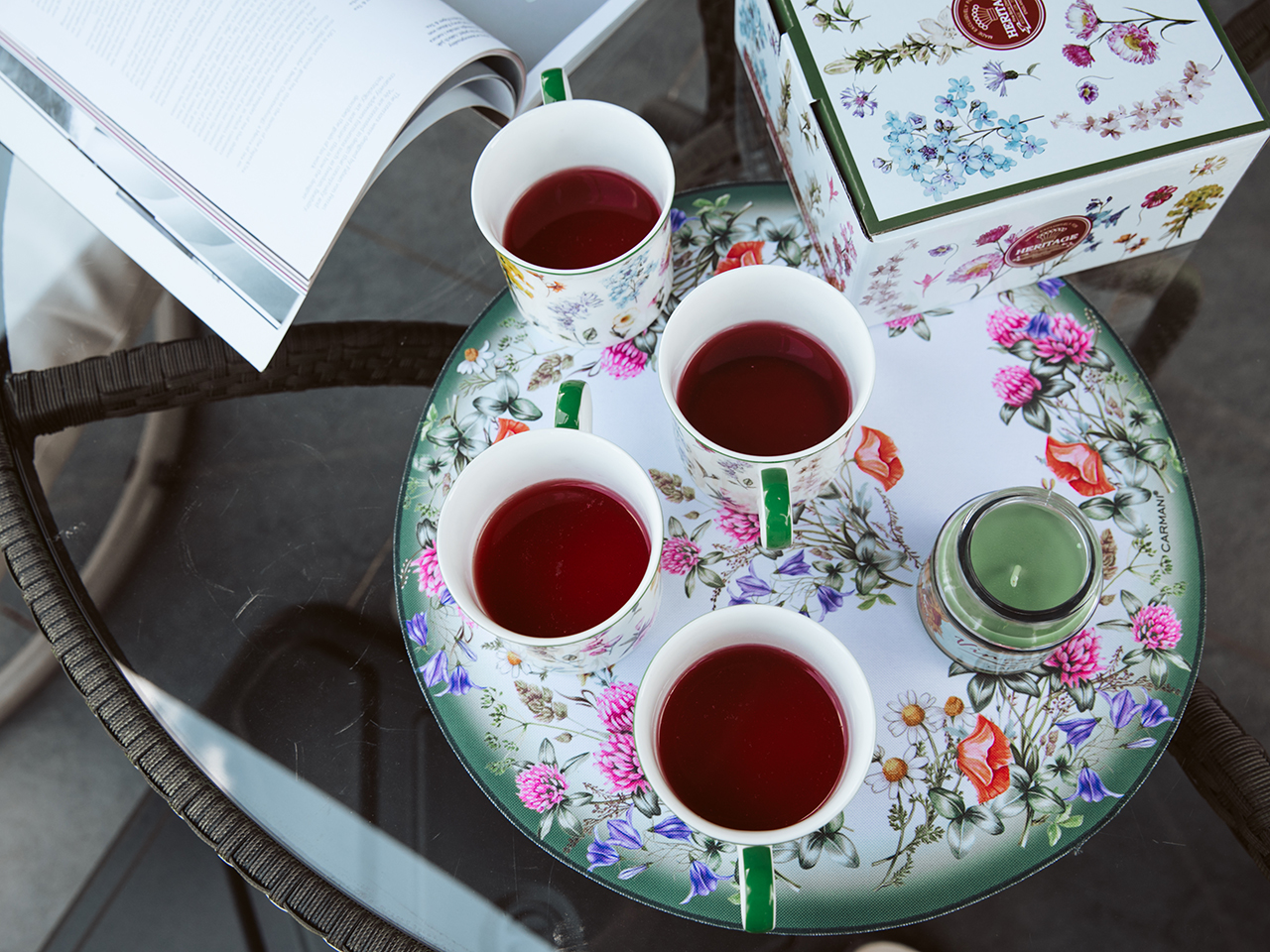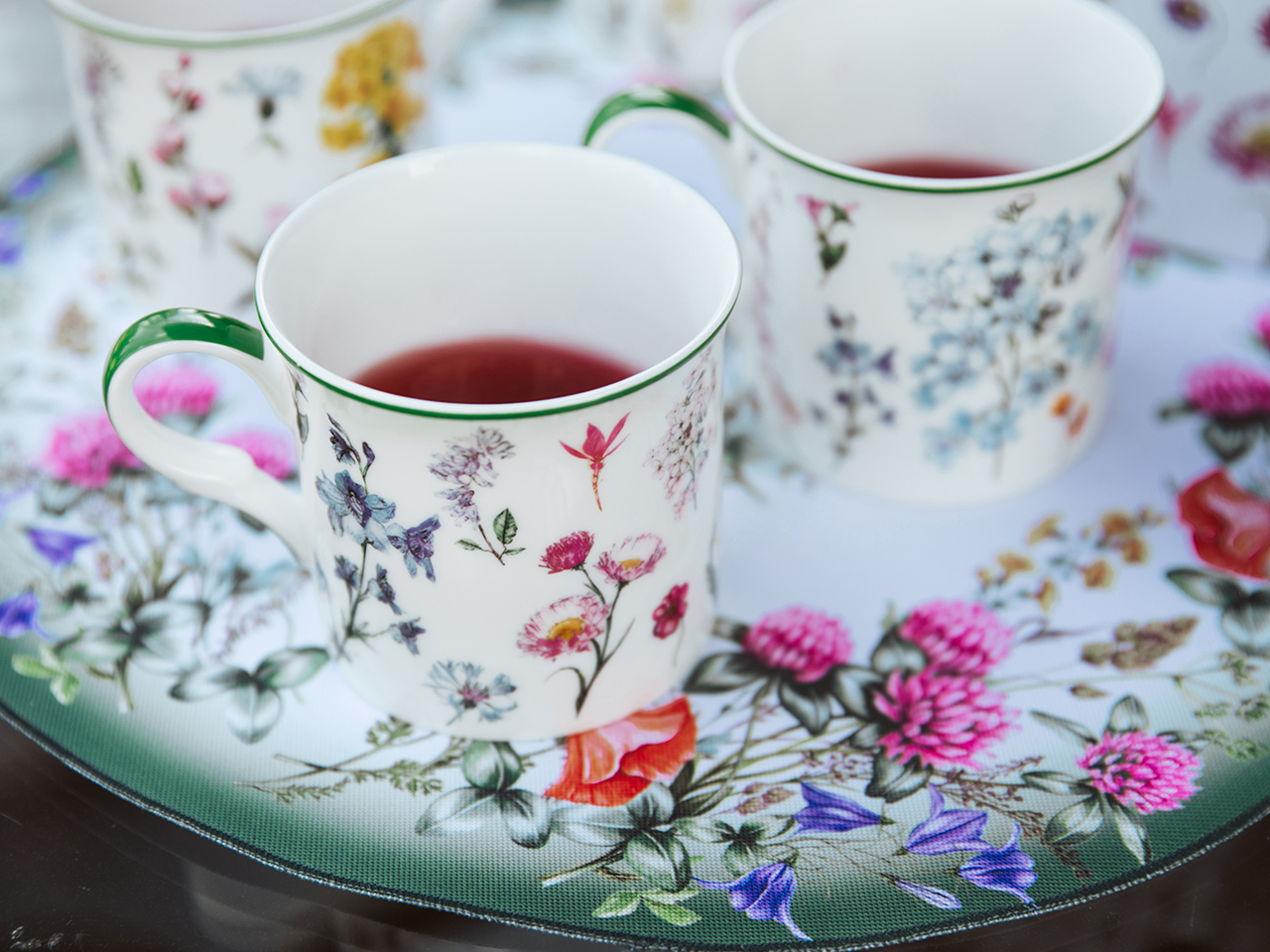 Zestaw czterech porcelanowych kubków o pojemności 295ml, każdy z unikalną kwiatową ilustracją. Kubki są trwałe, wygodne i idealne do codziennego użytku.