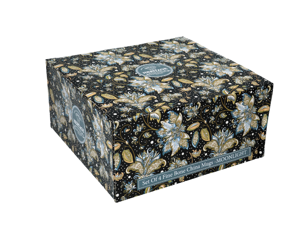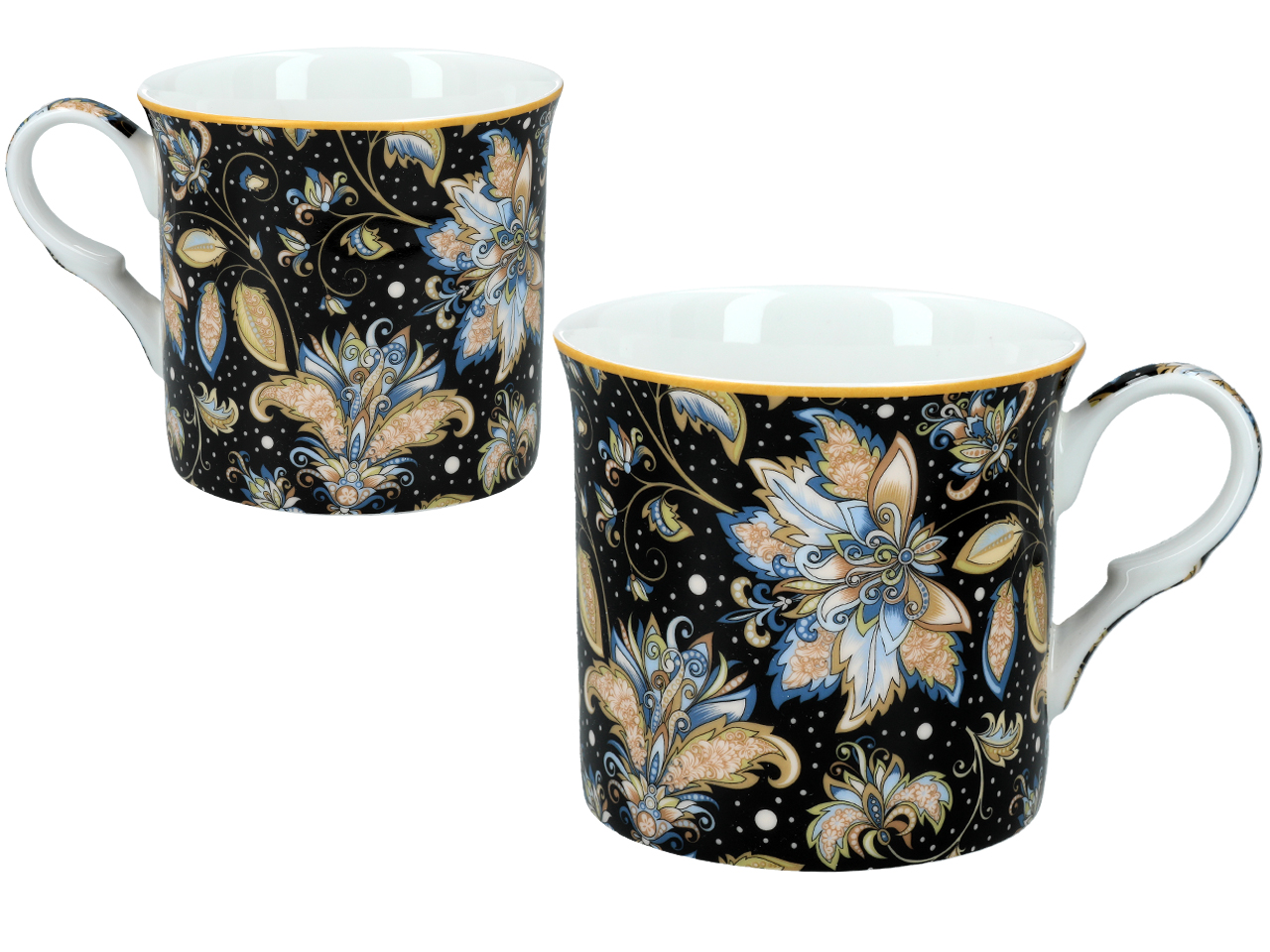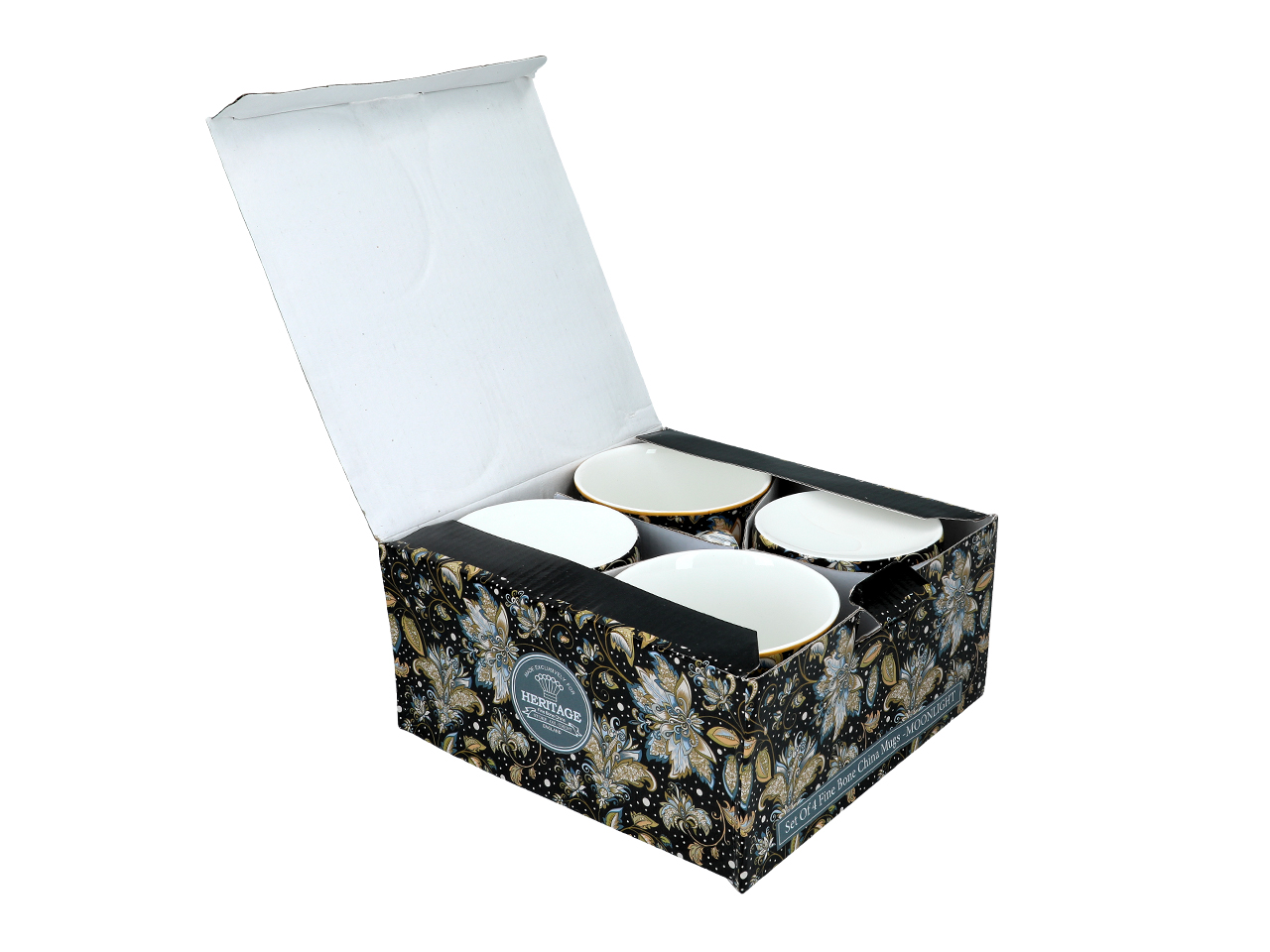 Zestaw czterech porcelanowych kubków o pojemności 295ml, każdy z unikalną kwiatową ilustracją. Kubki są trwałe, wygodne i idealne do codziennego użytku.