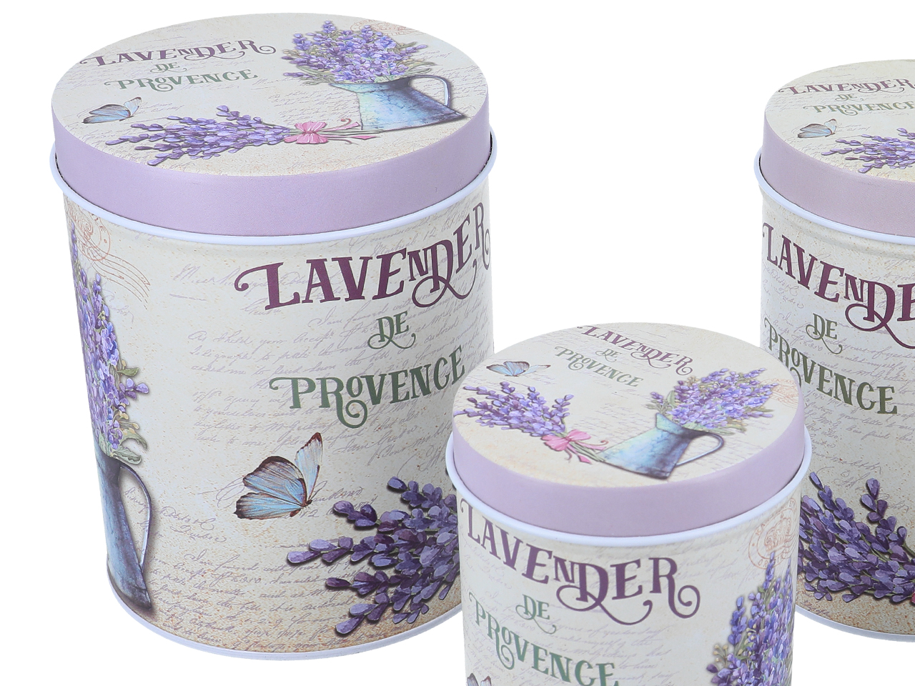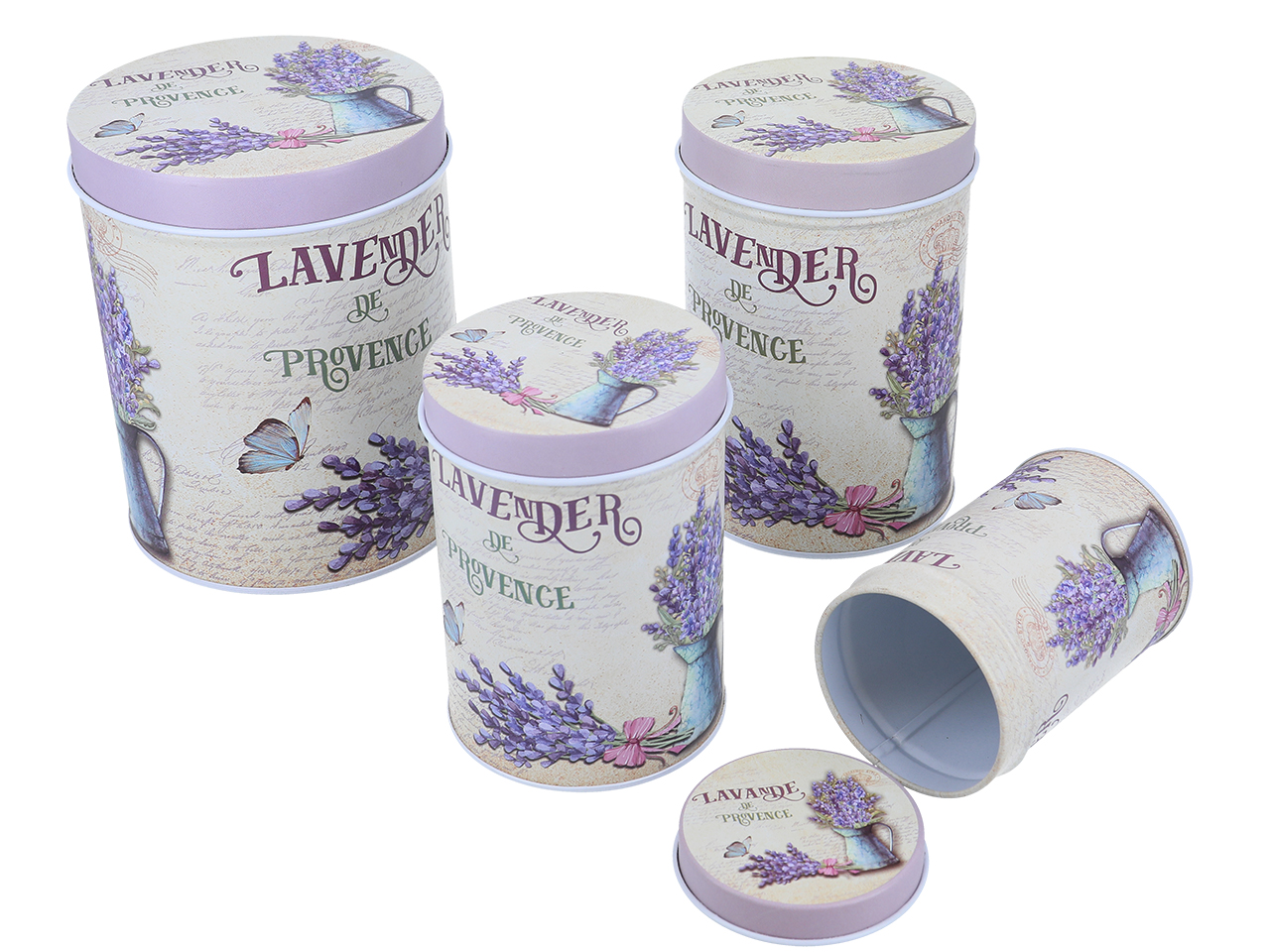 Kpl. 4 puszek w różnych rozmiarach, z piękną dekoracją Lavendy. Świetnie nadają się do przechowywania produktów spożywczych lub innych drobiazgów.