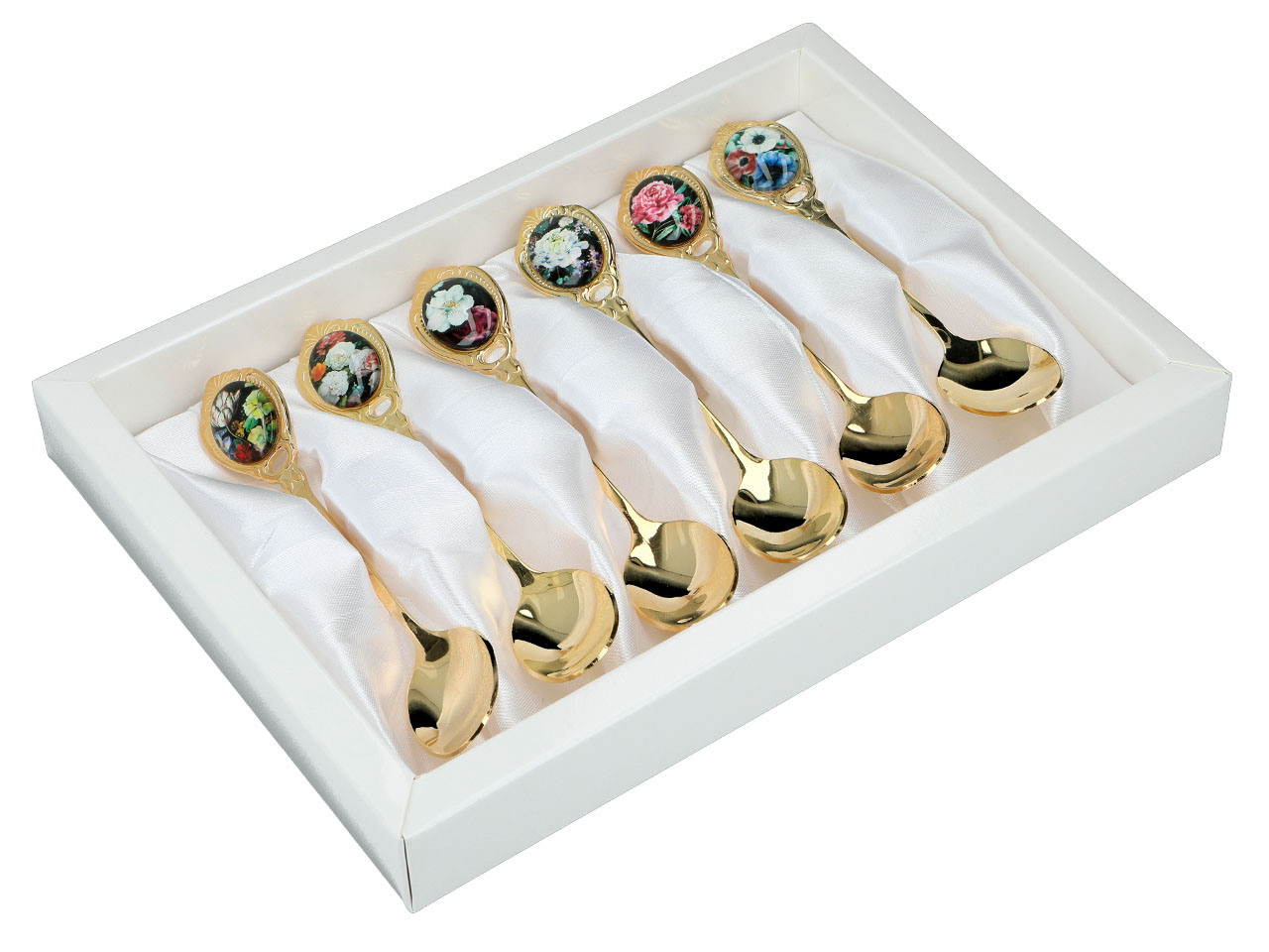 Zestaw składa się z 6 ozdobnych łyżeczek w kolorze złotym. Zapakowane w białe, eleganckie pudełko.