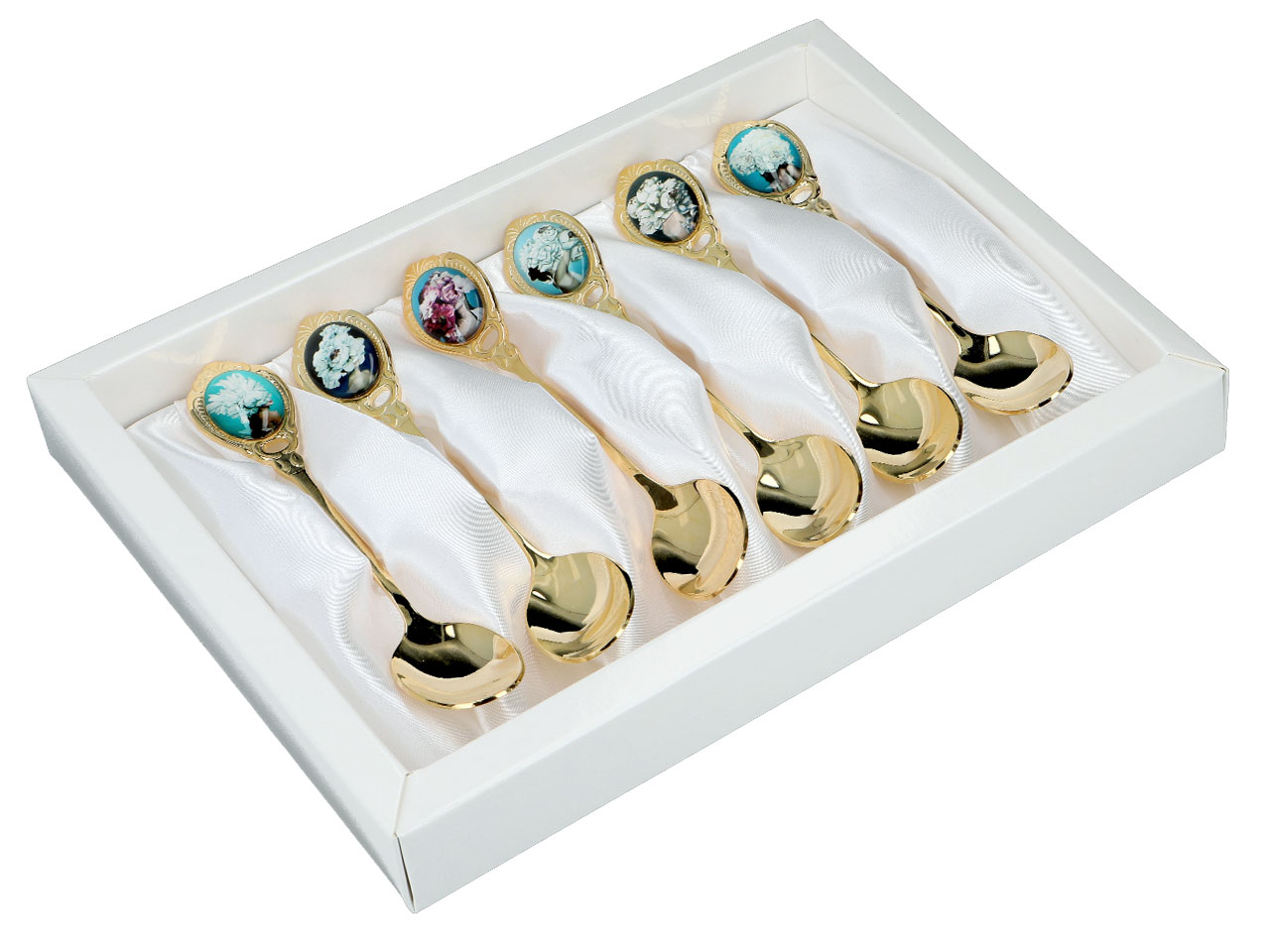 Zestaw składa się z 6 ozdobnych łyżeczek w kolorze złotym. Zapakowane w białe, eleganckie pudełko.