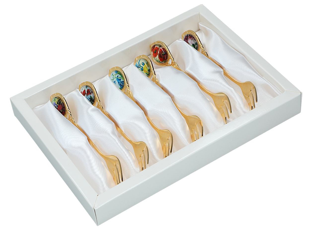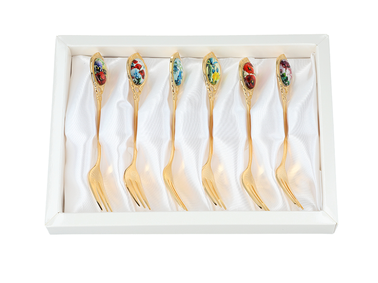 Zestaw składa się z 6 ozdobnych widelczyków w kolorze złotym. Zapakowane w białe, eleganckie pudełko.