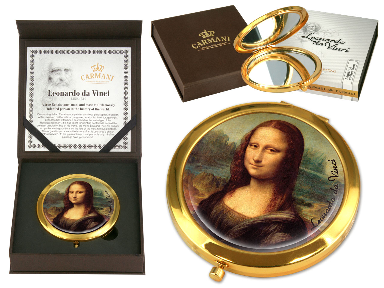Urocze, małe lustereczko z motywem twórczości Leonarda da Vinci. Doskonałe do każdej kobiecej torebki. Zajmuje mało miejsca a jego piękne zdobienia dodają uroku.
