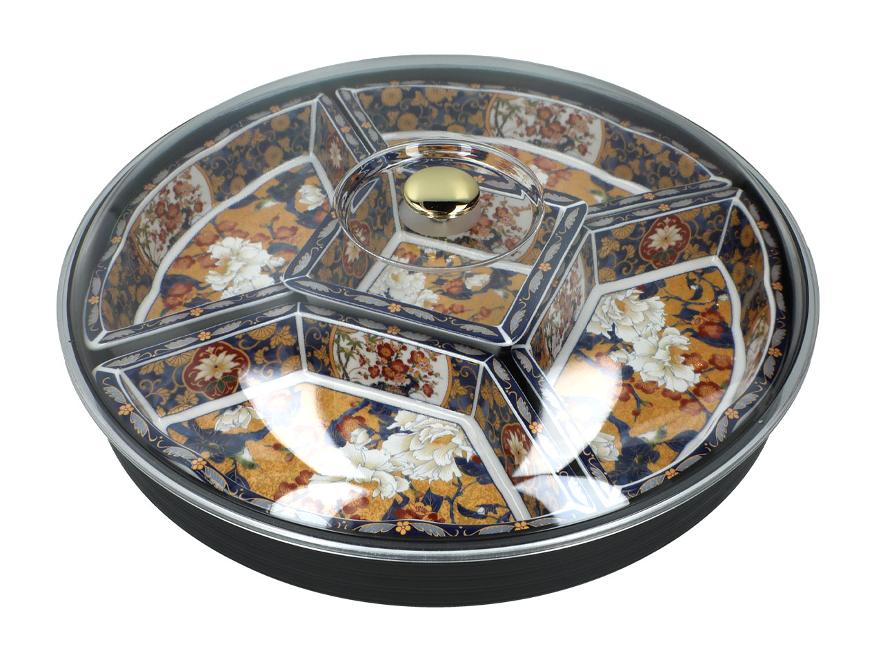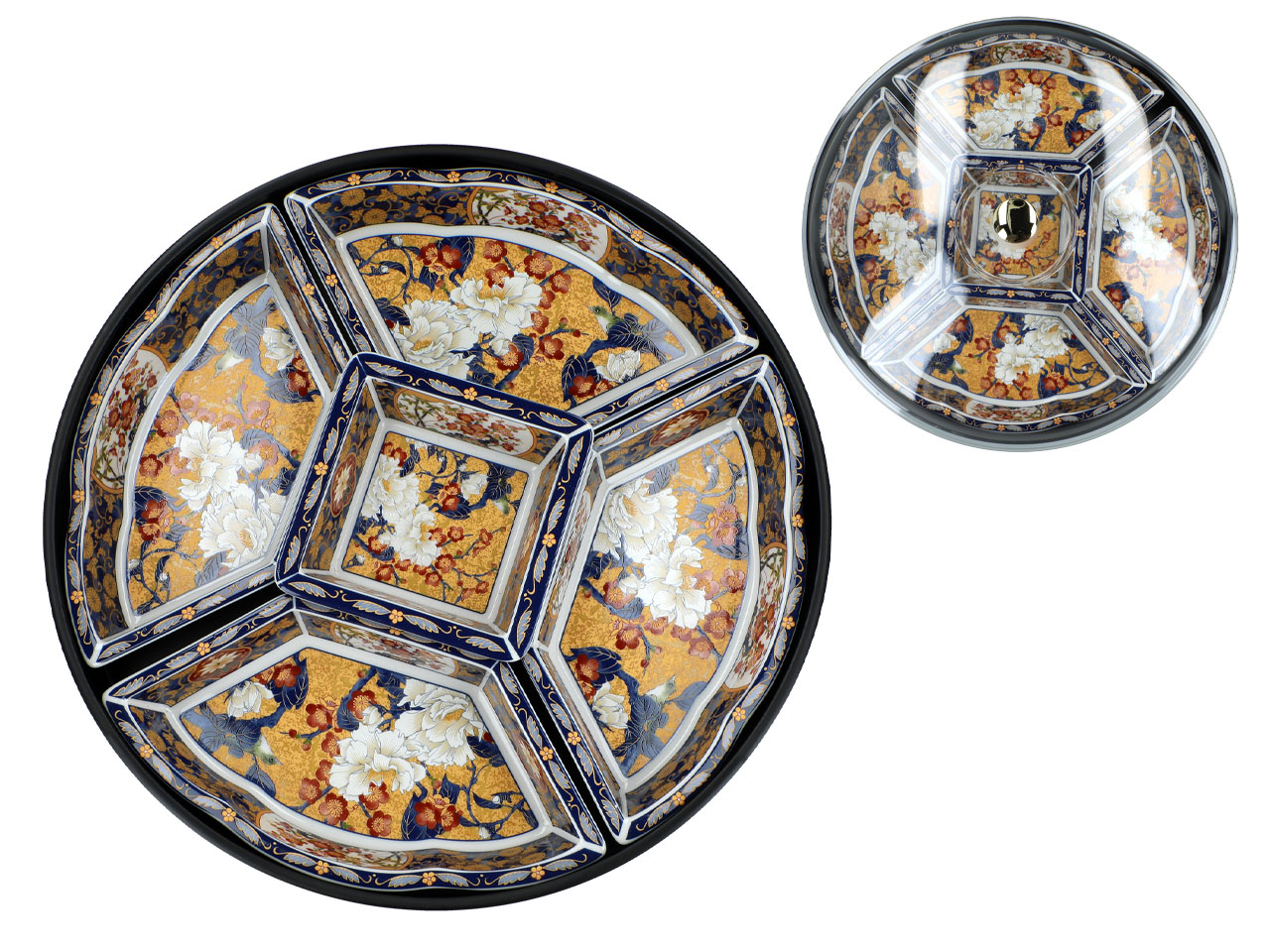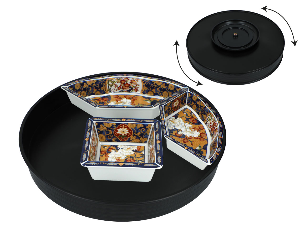 Piękne naczynie wykonane jest z oryginalnej japońskiej ceramiki. Składa się z sześciu miseczek na tacy obrotowej.