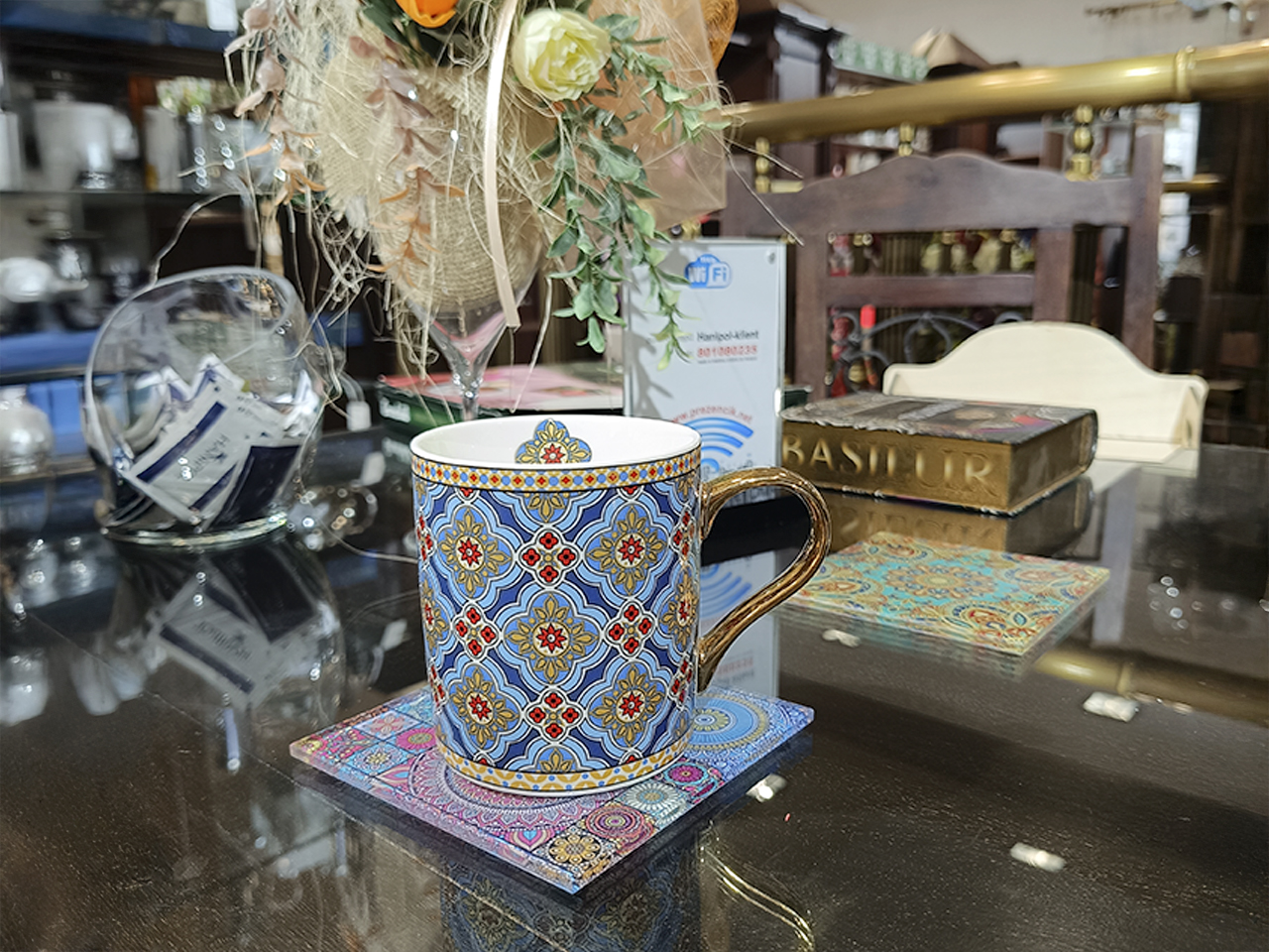 Gustowna, kwadratowa podkładka pod kubek ozdobiona motywami zaczerpniętymi z orientu ożywi stylizację każdego stołu.