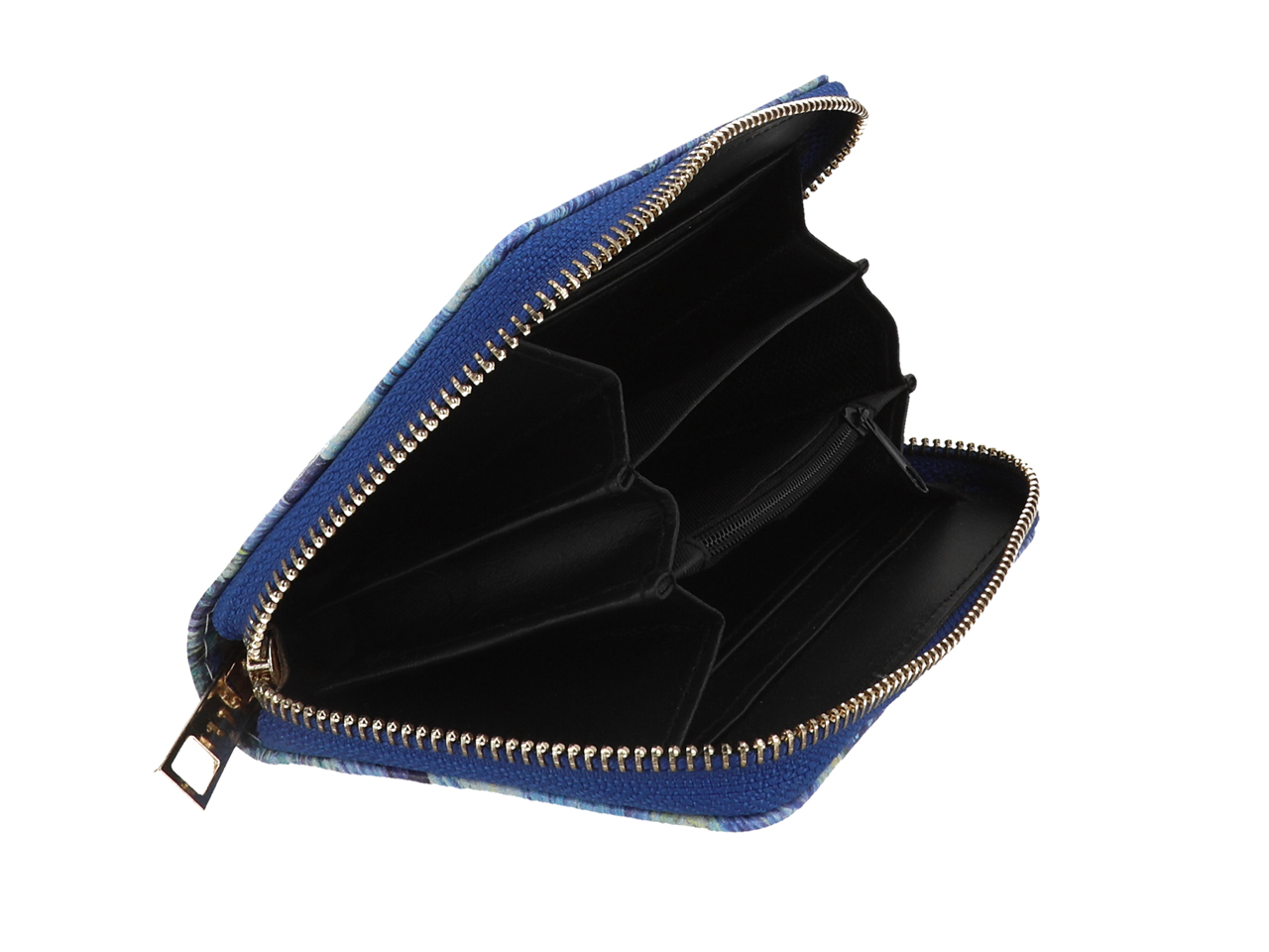Pięknie ozdobniony portfel na suwak. Posiada przegródki na banknoty, karty płatnicze, wizytówki oraz zamykaną kieszonkę na monety.