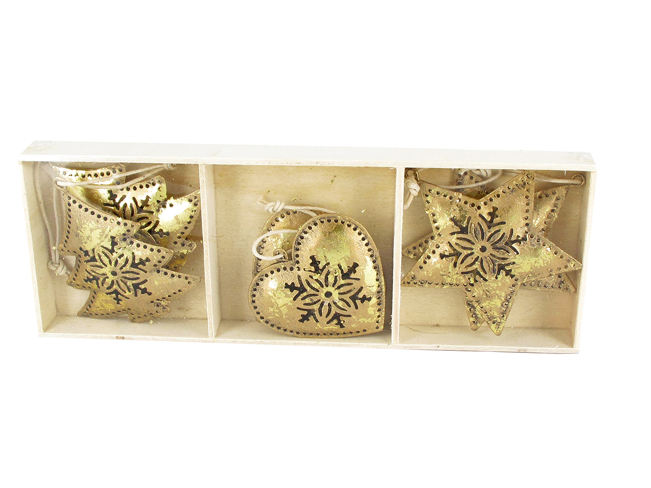 Złote ozdoby choinkowe w drewnianym pudełeczku (metaloplastyka)